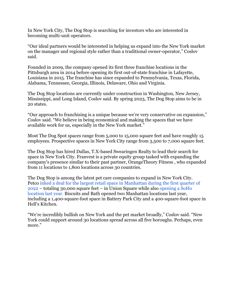 This new partnership will provide much-needed capital, operational guidance and support to our growth plans for the future. The team will immediately focus on boosting development efforts to bring new qualified franchisees into the system, establish new marketing programs and add new technologies to the business model, which will help differentiate The Dog Stop® from the competition and improve operations across the board. Additionally, we will be building out a new flagship corporate location, new training facilities, and new corporate headquarters here in Pittsburgh, PA.